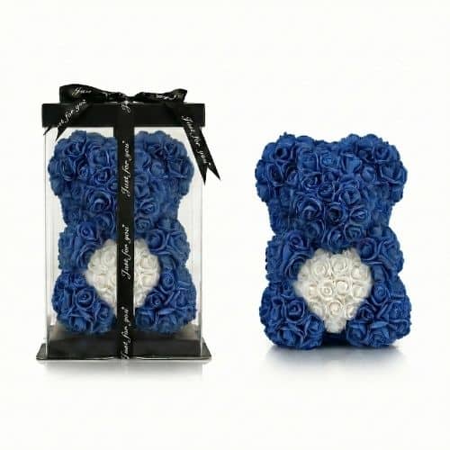 Stell dir vor, du verschenkst ein Versprechen. Blau ist die Farbe der Loyalität, der Weisheit und der Tiefe – wie der Ozean. In der Mitte dieses starken Bären leuchtet ein strahlend weisses Herz, das Unschuld und Wahrheit symbolisiert. Diese Kombination sagt unmissverständlich: “Meine Treue zu dir ist grenzenlos und mein Herz ist rein.” Das klare Design ohne Masche lenkt den Fokus voll auf diese starke Botschaft. Ein beeindruckendes Geschenk für deine Liebsten, handgefertigt aus ewigen Rosen.