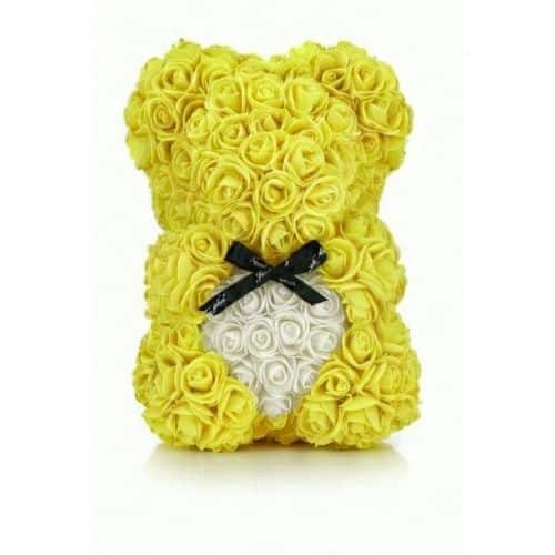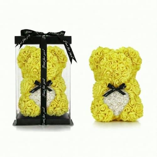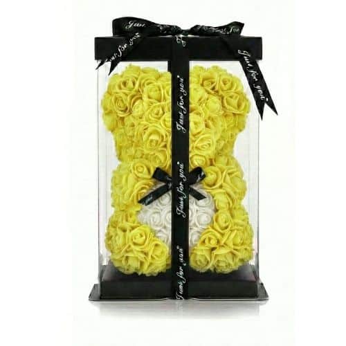 Stell dir vor, du verschenkst pures Glück. Gelb ist die Farbe der Sonne, des Lichts und der ewigen Freundschaft. Sie steht für Energie, Optimismus und einen Neuanfang. In der Mitte dieses leuchtenden Bären ruht ein sanftes, weisses Herz, das Ruhe und Ehrlichkeit symbolisiert. Diese Kombination sagt ganz ohne Worte: “Du machst mein Leben heller” und “Ich bin immer ehrlich zu dir”. Ein wundervolles Geschenk, um “Danke” zu sagen, handgefertigt aus ewigen Rosen.