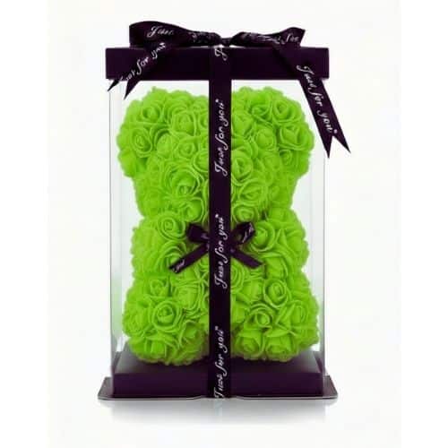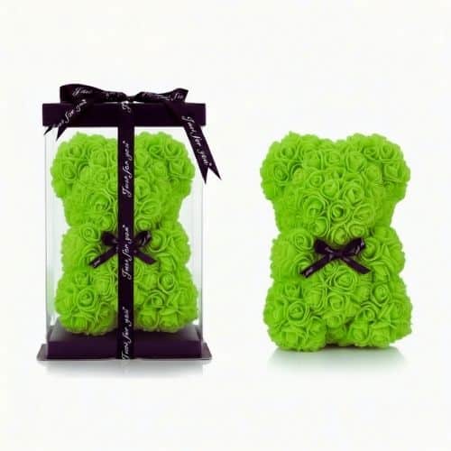 Stell dir vor, du verschenkst ein Symbol für das blühende Leben. Grün ist die Farbe der Erneuerung, der Gesundheit und des inneren Gleichgewichts. Sie wirkt beruhigend und belebend zugleich. Die klassische schwarze Masche mit der Aufschrift “Just for you” bildet einen edlen Kontrast zum lebendigen Grün und macht den Bären zu einem stilvollen Blickfang. Dieser Bär sagt: “Viel Glück” und “Ich wünsche dir nur das Beste”. Ein einzigartiges Geschenk, handgefertigt aus ewigen Rosen.