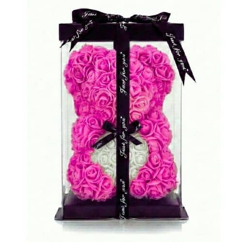 Stell dir vor, du überreichst ein Symbol für das erste Verliebtsein und tiefe Zuneigung. Pink ist die Farbe der Zärtlichkeit, der Romantik und der weiblichen Energie. Sie wirkt frech, modern und unglaublich herzlich. In der Mitte strahlt das reinweisse Herz für ehrliche Absichten, umrahmt von der stilvollen schwarzen Masche mit der Aufschrift “Just for you”. Dieser Bär sagt charmant: “Ich mag dich unglaublich gern.” Ein unvergessliches Geschenk, handgefertigt aus ewigen Rosen.